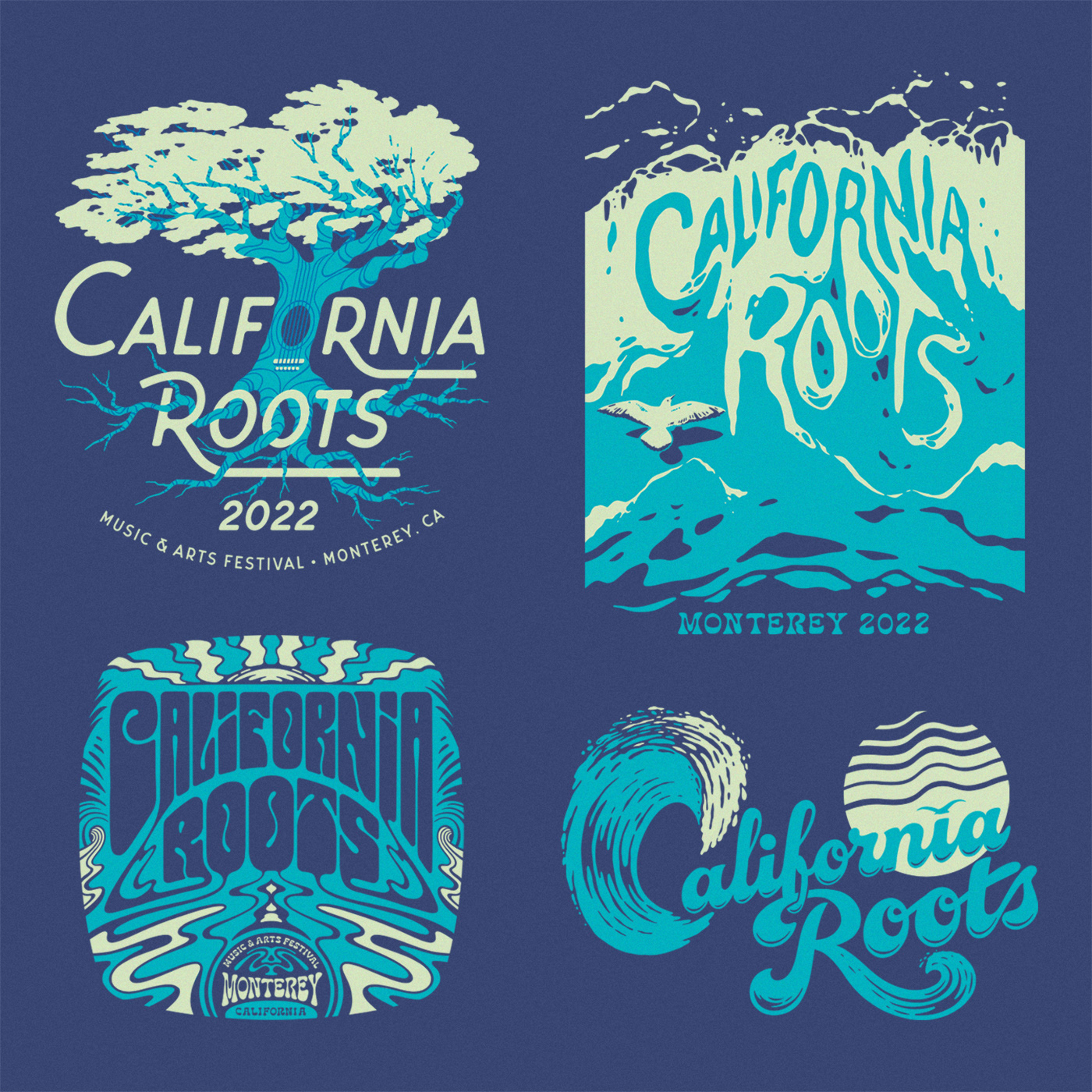 Various t-shirt and typography treatments for California Roots Music & Arts Festival in Monterey, California.