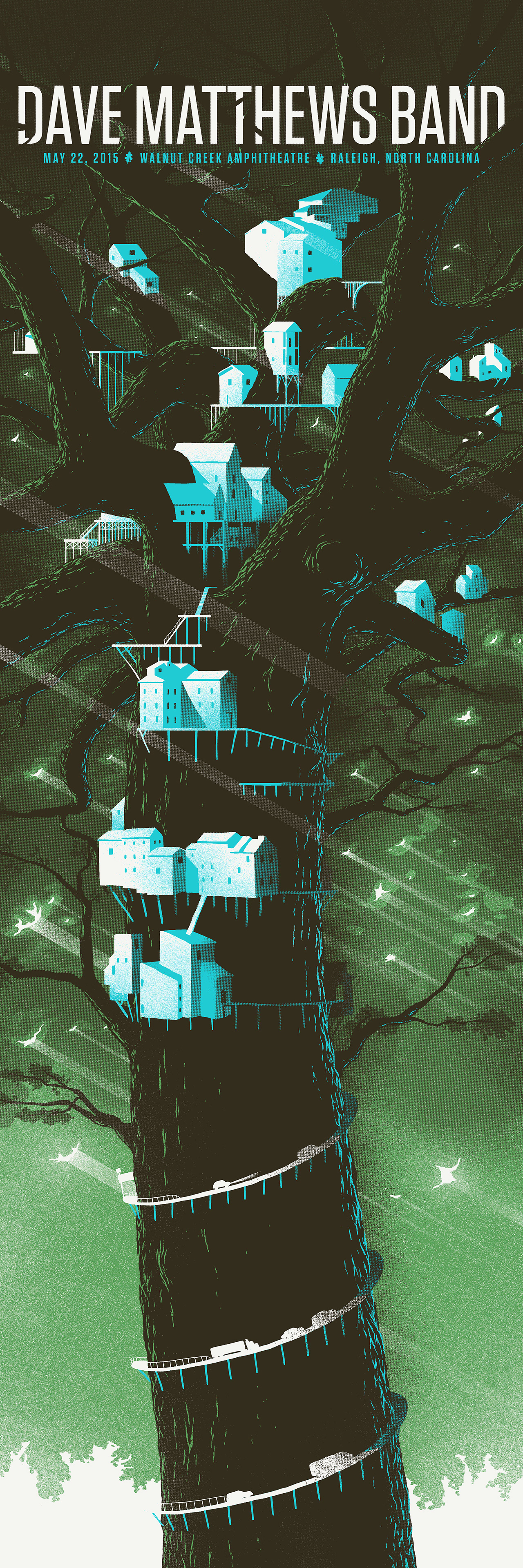 Poster for Dave Matthews Band in Raleigh, North Carolina. May 22, 2015. 12 x 36 Inches, 3-colors. Printed by The Half and Half in Columbia, SC.